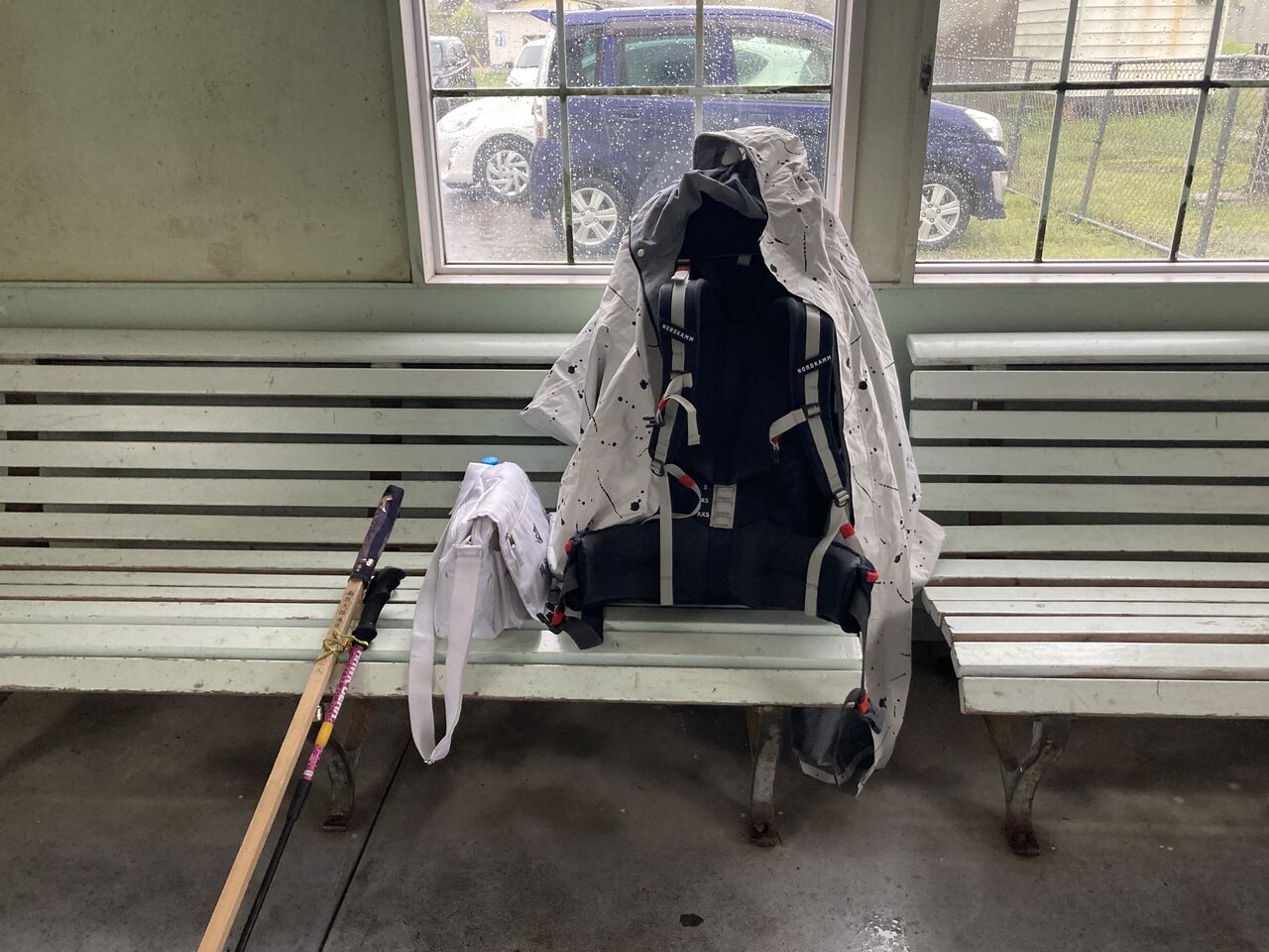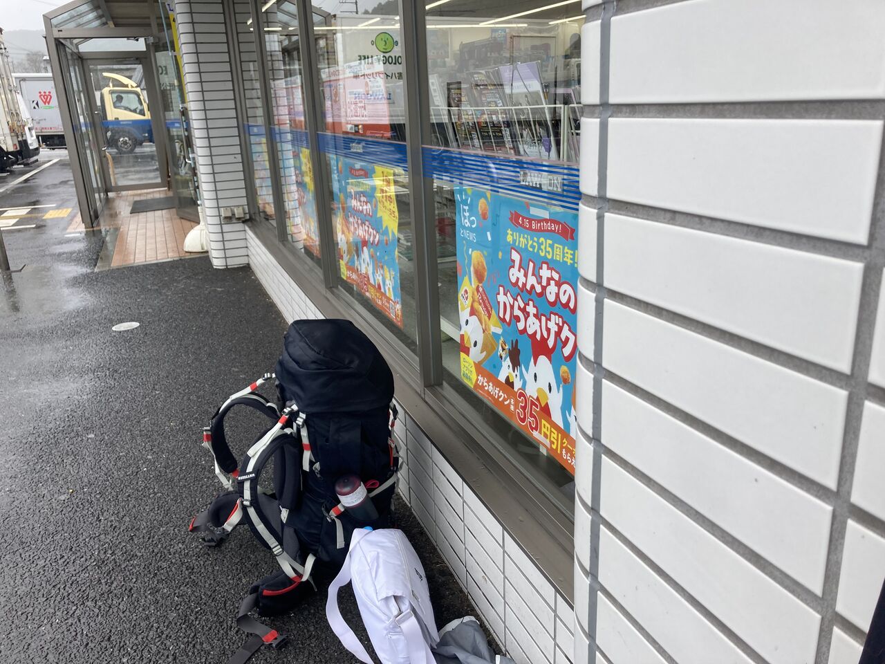 雨が上がったのでポンチョを脱ぐのとコンビニ