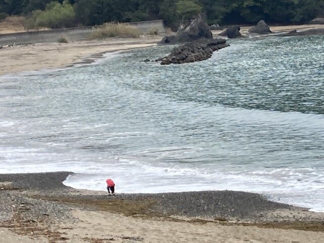 熱心に貝殻を拾っているお姉さんがいた