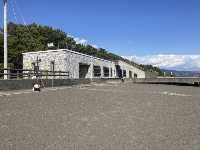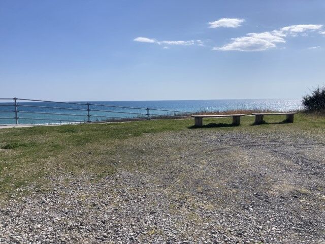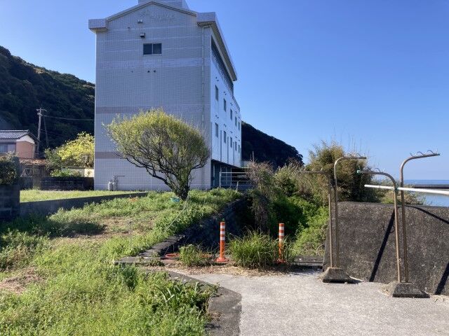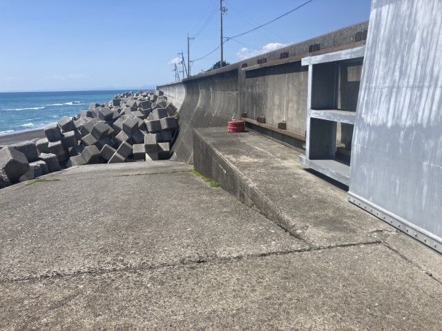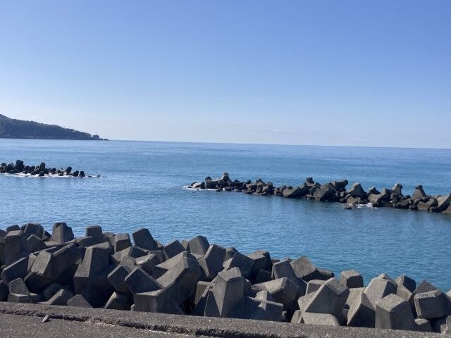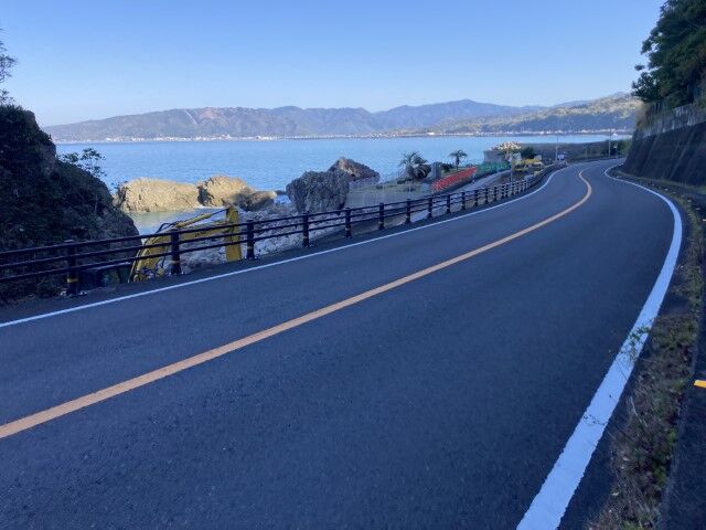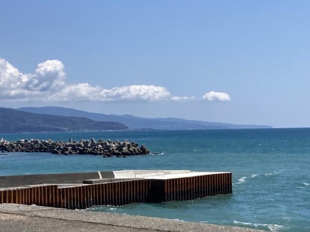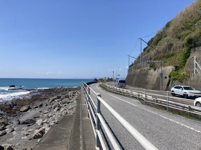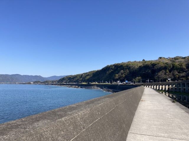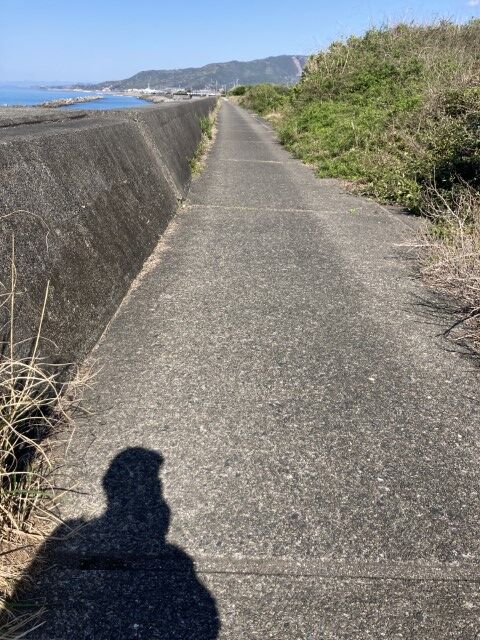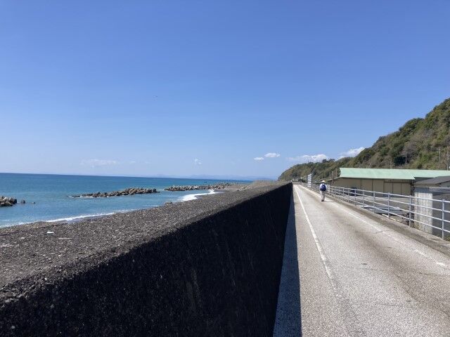 トンネルを迂回した後はラブホの脇を通って海沿いの堤防を歩く。