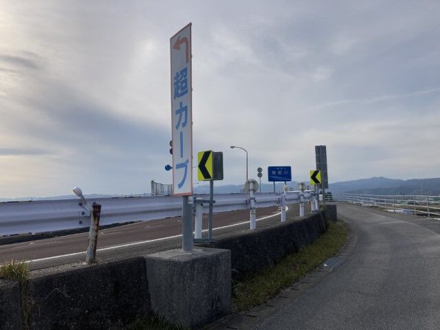 超カーブの橋にきた。レアな標識だな