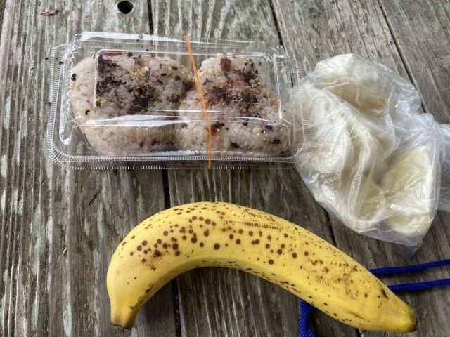 大岐の浜でいただいたお接待おにぎりを食べる。
