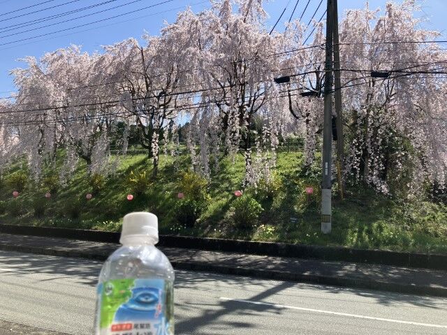しだれ桜を目の前に眺めながら水を飲む。