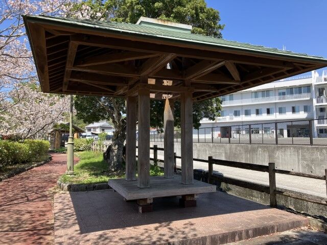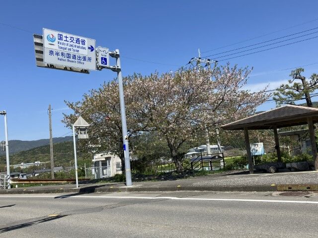 橋のたもとの休憩所と桜。