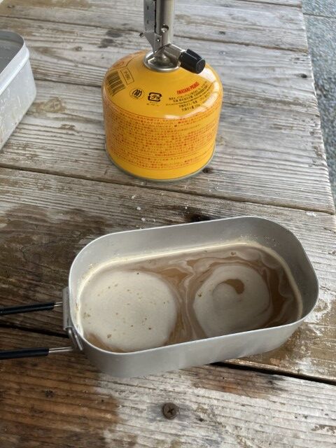持ってきた紙コップを3回しか使っていないのに底から漏れてきたからダイソーのメスティン(小)に移し替えてコーヒーを飲む。