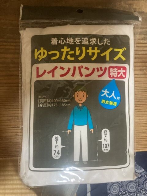 そういえば持ってきたダイソーのレインパンツは2度目にはいたときにケツが思い切り破れたのだった笑